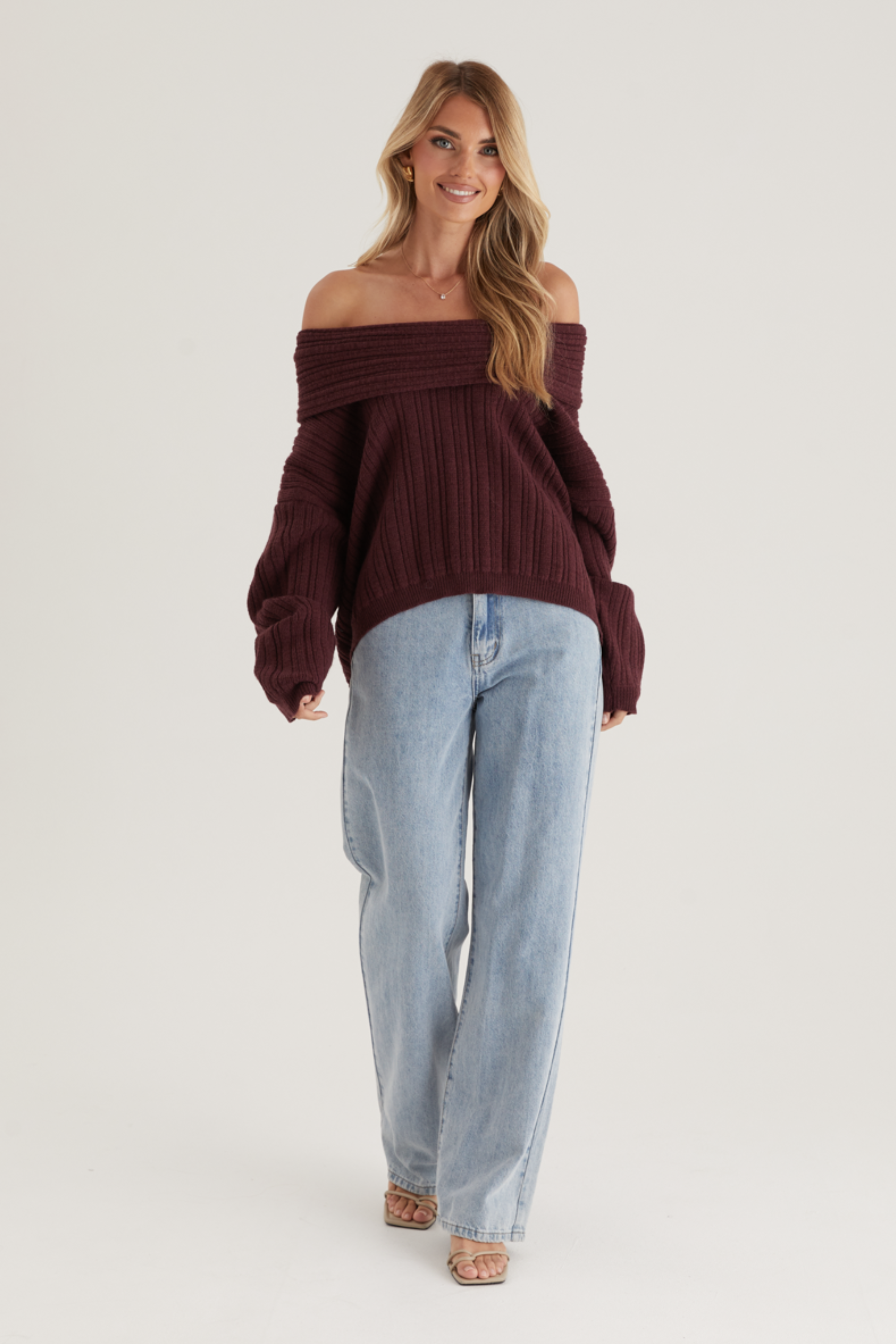 Add a hint of romance to your winter wardrobe with the Shiloh Off Shoulder Sweater in Wine. This flattering cut works well with fitted skirts or wide-leg pants. Finish with boots, a mini shoulder bag, and layered gold necklaces.